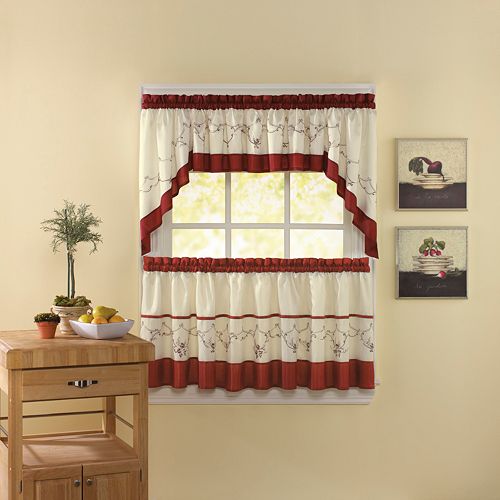 3 Piece Kitchen Window Set With Florally Embroidered Sheer Banners