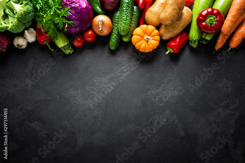 Culinary Background With Fresh Raw Vegetables On A Black Kitchen