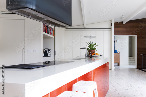 Close Up Of Modern Kitchen Island Bench With Orange Accent Color